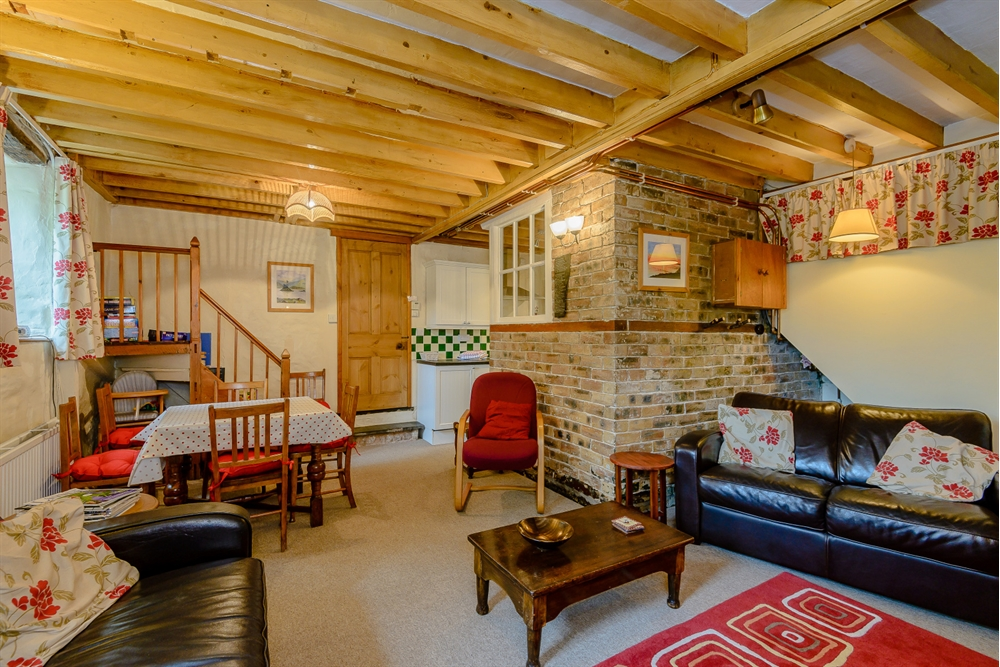Downstairs: Beamed sitting/diner with inglenook fireplace and old bakers oven; partially screened-off modern kitchen. Upstairs: Two double bedrooms. 3rd bedroom with full-length, sturdy children's bunks; bath/shower & toilet.